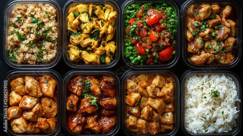 A meal preparation with glass container, packed with healthy meals like stir-fried chicken, brown rice, microwave behind, top view.