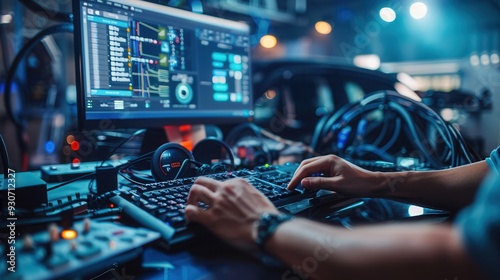 A mechanic conducts a detailed computer diagnosis and works on engine repairs at an auto repair shop. Generative AI