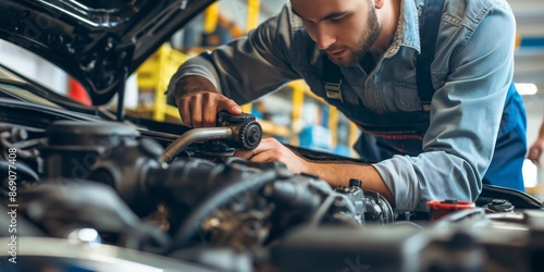 A mechanic is meticulously working under the hood of a car, using a wrench to repair or maintain the vehicle's engine, in a well-lit, organized garage setting.