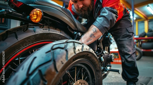 A mechanic replacing a worn-out tire on a motorcycle, demonstrating the necessity of routine maintenance to ensure optimal performance and safety