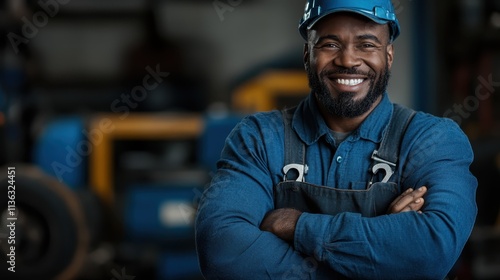 A mechanic with a confident smile stands proudly in a workshop, symbolizing positivity and satisfaction in his professional environment with machinery around.