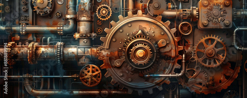 A mechanical background with gears and cogs set against a backdrop of industrial pipes and machinery, creating a sense of mechanical complexity.