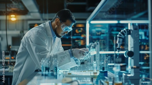 a mechanical engineer at work in a high-tech lab, surrounded by intricate machinery and tools, analyzing blueprints on a digital tablet, wearing safety goggles and a lab coat.