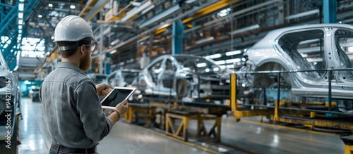 A mechanical engineer oversees car production at a cuttingedge factory, ensuring quality via a tablet. They manage manufacturing processes to uphold efficiency and quality control