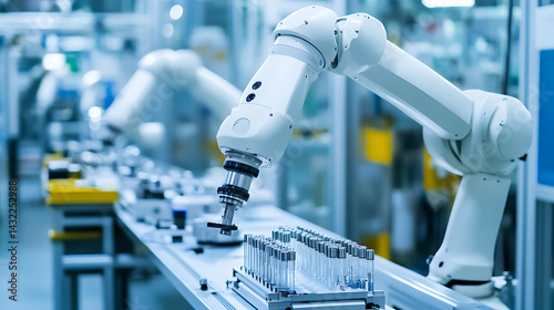 A mechatronics expert creating robotic arms for automating assembly of electric motorcycles, automotive facility with robotic arms assembling motorcycle frames, batteries