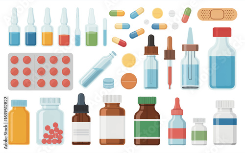 A medical and pharmaceutical illustration set on a white background featuring various medication and healthcare items arranged in a flat design style.