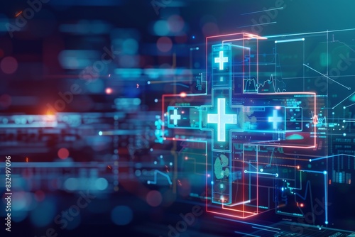 A medical cross morphing into a telemedicine screen, showcasing the advancements in healthcare delivery generated by AI