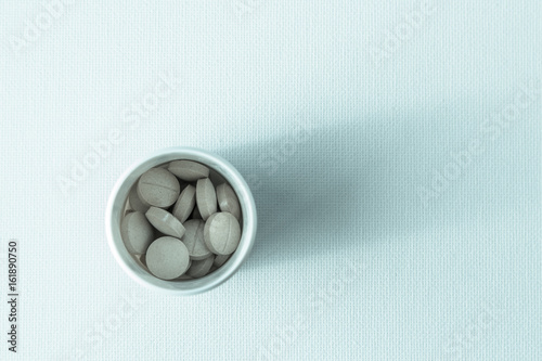 A medical image consisting of a white pill bottle on a light blue plain background. This image can be used to represent healthcare.