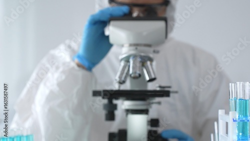 A medical virologist in protective gear and blue gloves examines viral samples under a microscope while conducting research in a sterile laboratory setting