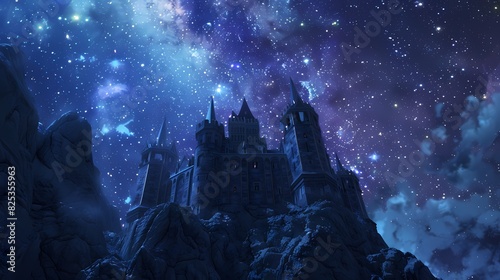 A medieval castle standing tall and proud against the backdrop of a defocused, starry night sky filled with particles -