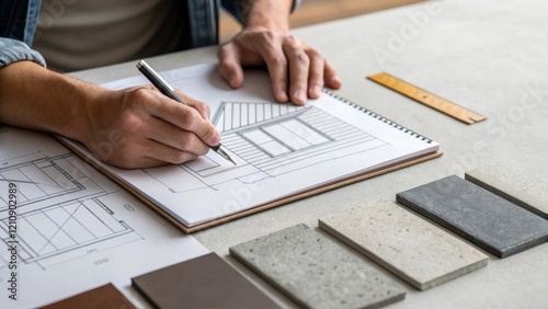 A medium closeup of an architects hands sketching a new building design that prominently features recycled materials with samples of steel and concrete laid out on the table.