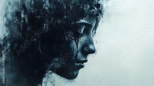 A melancholic blue portrait dissolving into mist, evoking sadness and loss. The closed eyes and single tear convey deep emotion, enhanced by the surreal atmosphere. Abstract Medical Pain