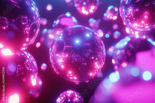 A mesmerizing 3D abstract background showcasing a surreal blend of floating neon orbs and streaming holographic data, forming an intricate web of luminous connections. The reflective surfaces and