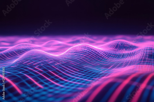 A mesmerizing 3D abstract background where a floating, glowing waveform stretches across an infinite grid. The neon pulses move in sync with an invisible beat, forming a stunning representation of