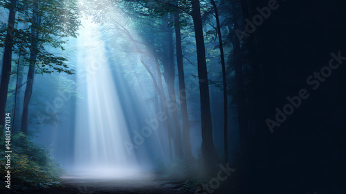 A mesmerizing beam of light dramatically pierces through the dense canopy of tall trees in a tranquil forest creating an ethereal and enchanting scene.
