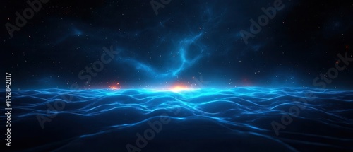 A mesmerizing cosmic landscape featuring glowing waves and ethereal light against a dark backdrop, evoking a sense of vastness and tranquility.