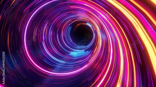 A mesmerizing digital artwork featuring a futuristic, neon-lit tunnel with swirling, vibrant colors in shades of blue, pink, purple, and green, creating a sense of motion and depth