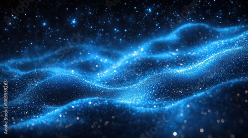 A mesmerizing display of glowing blue waves and shimmering particles in a dark cosmic environment during nighttime