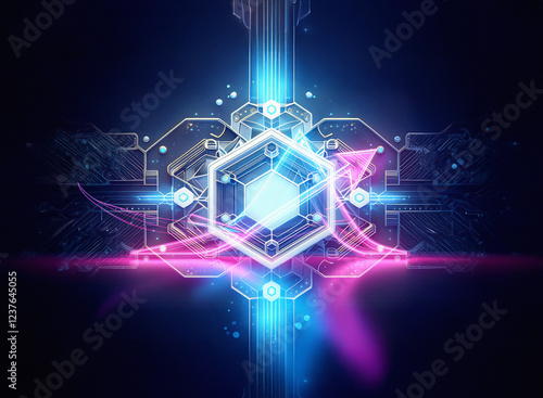 A mesmerizing double exposure artwork. Glowing hexagons and circuitry create a vibrant, symmetrical design with pink and blue energy streams. Abstract technological and futuristic concept.