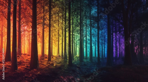 A mesmerizing forest scene with trees illuminated in a spectrum of rainbow colors, creating a magical and enchanting atmosphere.