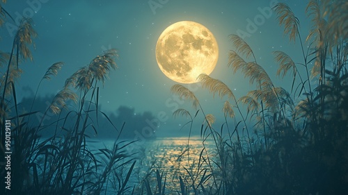 A mesmerizing full moon illuminates a tranquil night scene, with tall grasses gently swaying by the water's edge.
