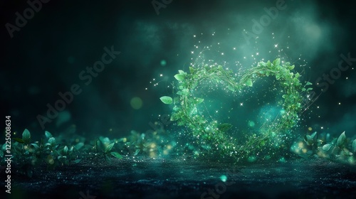 A mesmerizing heart-shaped design made from vibrant green leaves and sparkling elements, set in a mystical and serene environment.