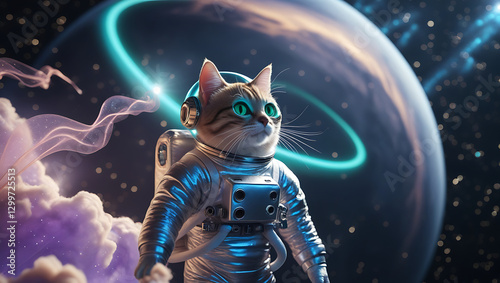 A mesmerizing, hyper-realistic visual representation of astronaut cat, suspended in mid-air, surrounded by a majestic, gas-giant planet with iridescent, created by generative ai