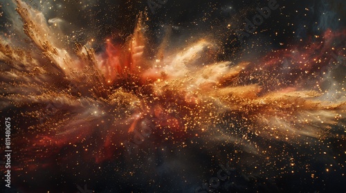 A mesmerizing image capturing the intense burst of red and gold dust against a dark backdrop, frozen in time with high-speed photography