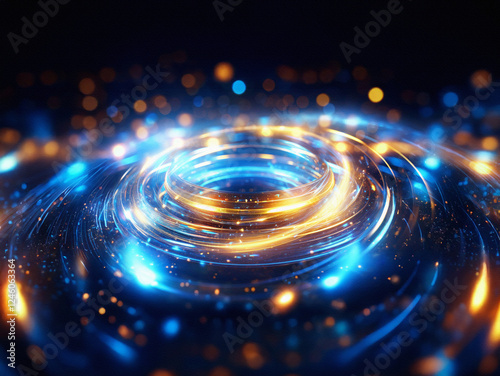 A mesmerizing ring of glowing gold and blue energy swirls in a dark void, creating concentric ripples of light and sparkling particles. The scene evokes a sense of cosmic mystery and power.