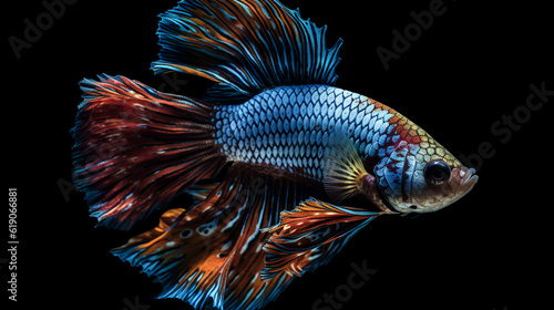 A mesmerizing sight unfolds as a Betta fish poses in a mirrored reflection, displaying its vivid colors and intricate patterns mirrored on the water's surface.
