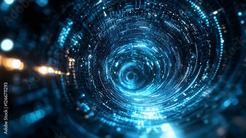 A mesmerizing swirl of blue lights creates a tunnel effect, evoking a sense of depth and motion in a digital space.