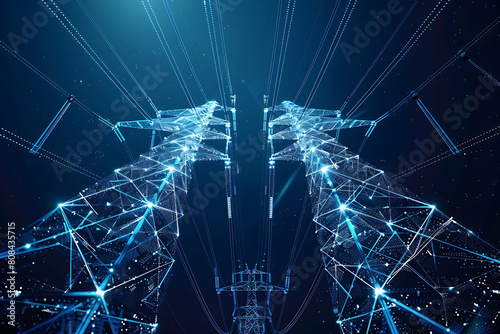 A mesmerizing wireframe rendition of transmission lines, showcasing technological innovation against a dark backdrop, ideal for illustrating energy infrastructure concepts