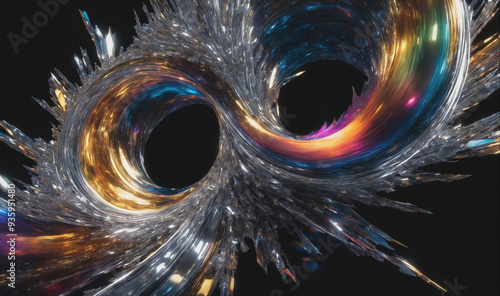 A metallic, iridescent shape with spikes rotates against a black background