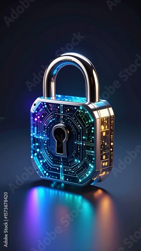 A metallic padlock, digitally enhanced, with glowing circuit board design. It casts a reflection on a dark surface
