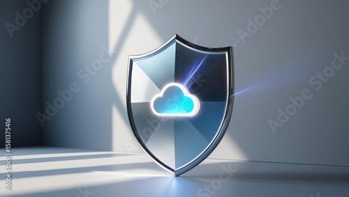 A metallic shield featu a glowing cloud icon symbolizes robust cloud security and data protection in a bright, modern digital environment for businesses.