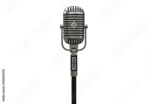 A metallic vintage-style microphone on a sturdy stand isolated on a white background