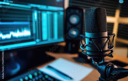 A microphone in front of a computer screen displaying audio editing software.
