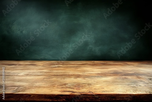 A microphone rests on a bare wooden table, with a dark green wall as the backdrop