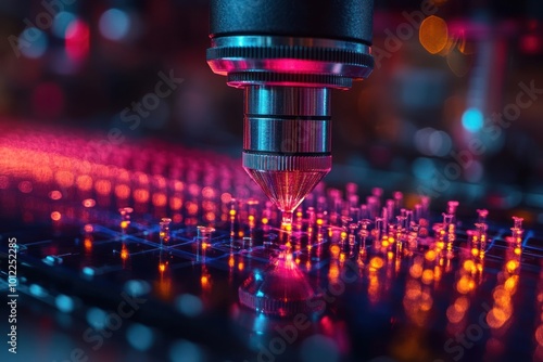 A microscope lens focused on a grid of tiny, glowing pins in a futuristic lab.