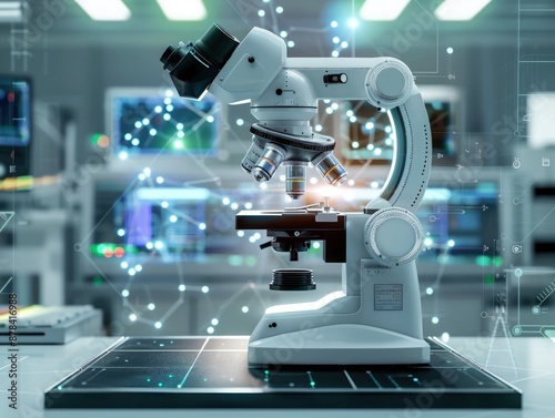 A microscope with a computer screen behind it. The computer screen is displaying a lot of data and the microscope is surrounded by a lot of wires