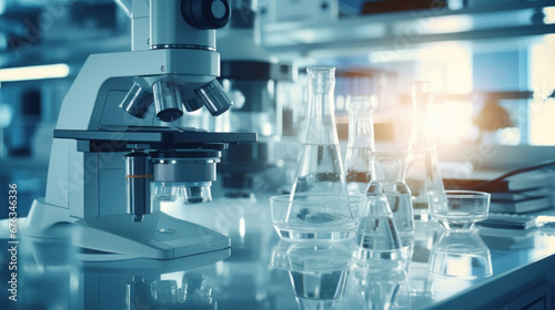 A microscope with lab glassware in modern medical laboratory. Microscope in lab.