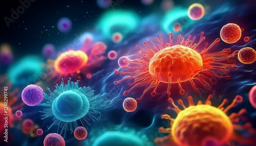 A microscopic view of bacteria or virus cells, glowing under a lab microscope with vibrant colors, showcasing the intricate details of these microorganisms.
