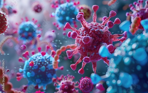 A microscopic view of various viruses, depicted as spheres and spiky shapes in shades of blue and pink, floating in a hazy atmosphere.