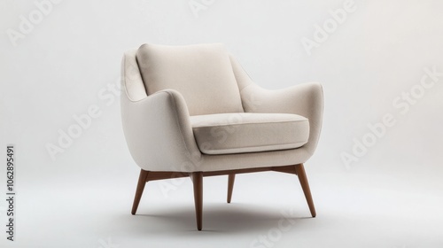 A mid-century modern armchair with tapered wooden legs and soft fabric upholstery.