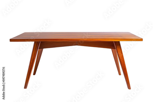 A mid-century modern coffee table with a walnut finish and tapered legs, isolated on white background, adding retro charm to living room decor