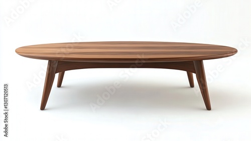 A mid-century modern coffee table with an oval shape and smooth walnut finish, centered on a crisp white background.