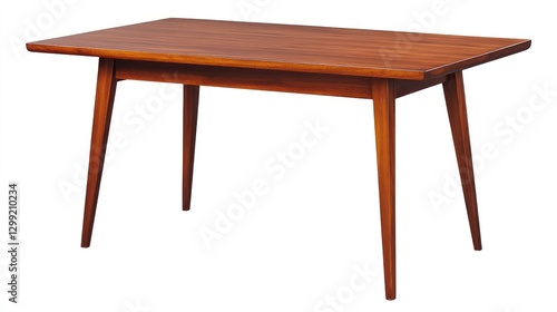 A mid-century modern dining table with a dark teak wood finish, featuring sleek tapered legs and a simple rectangular design