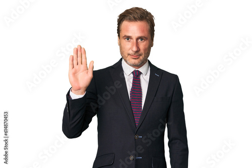 A middle-aged businessman isolated smiling cheerful showing number five with fingers.