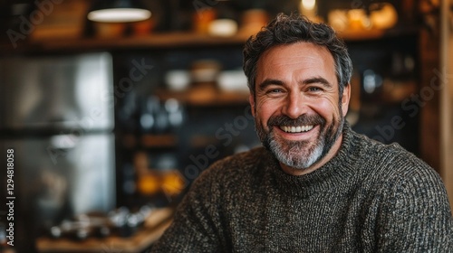 A middle-aged European man with a beard smiles joyfully in a rustic kitchen. Dressed in a cozy sweater, he radiates warmth and happiness. The inviting ambiance enhances the moment