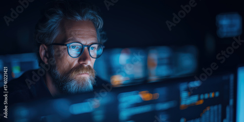 A middle-aged man with a beard wearing glasses is intensely focused on multiple computer monitors displaying data, cybersecurity work